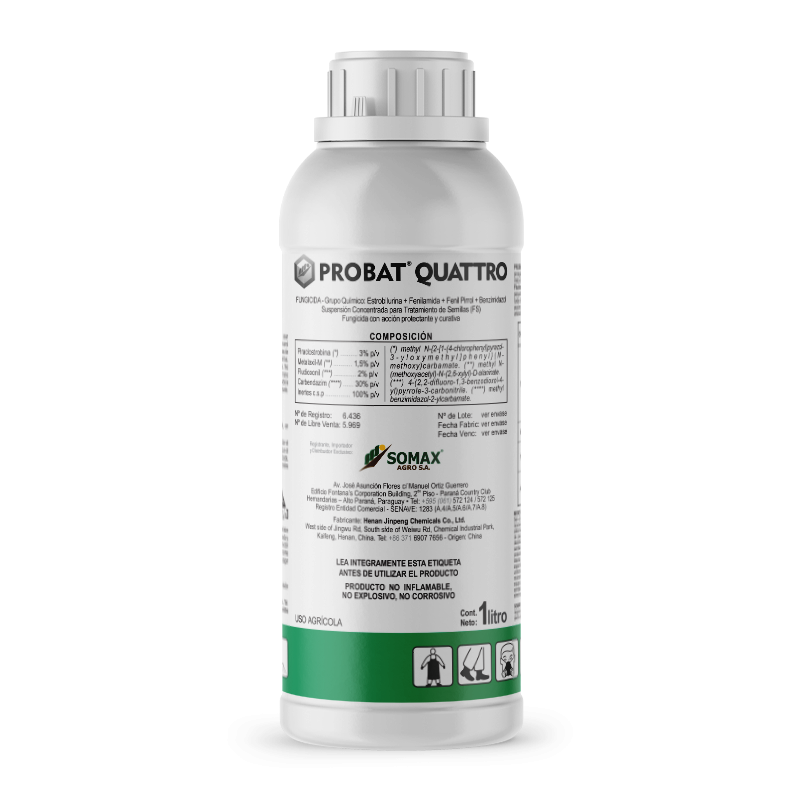 Probat Quattro es un fungicida para tratamiento de semillas para el control de enfermedades de la semilla y del suelo, protegiendo la germinación y desarrollo inicial  del cultivo. Piraclostrobina actúa como inhibidor del transporte de electrones en las mitocondrias de las células de los hongos, inhibiendo la formación de ATP, esencial en los procesos metabólicos de los hongos. Fludioxonil es un fungicida de contacto de amplio espectro con actividad residual. Tiene una limitada absorción por la semilla y una pequeña translocación dentro de la plántula. Metalaxil-M penetra en el tegumento de la semilla y es sistémicamente translocado a todas las partes de la planta durante la germinación. Carbendazim es un fungicida sistémico de translocación ascendente, con acción protectora y curativa, de amplio espectro. Posee rápida acción y su mecanismo de acción se caracteriza en actuar en la inhibición de los tubos germinativos, formación de apresorios y crecimiento de los micelios.