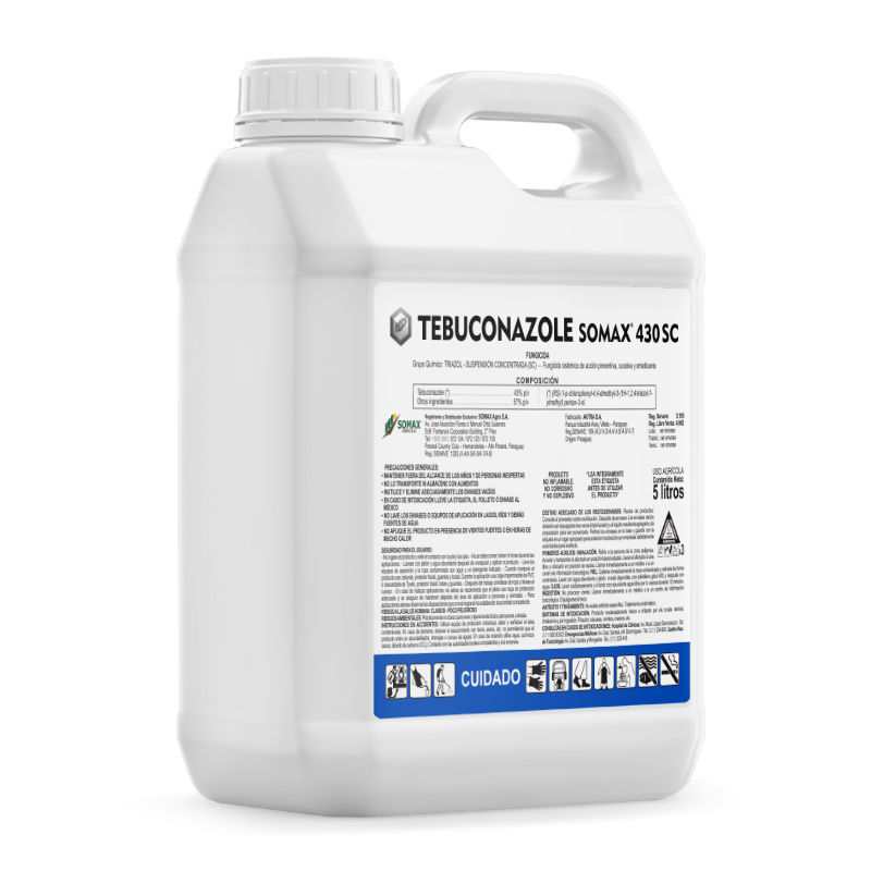 Tebuconazole Somax 430 SC es un fungicida sistémico de acción preventiva, curativa y erradicante. Es rápidamente absorbido por las partes vegetativas de la planta con translocación principalmente acropétala. Inhibe la biosíntesis del ergosterol en el hongo, impidiendo el desarrollo y multiplicación del mismo.